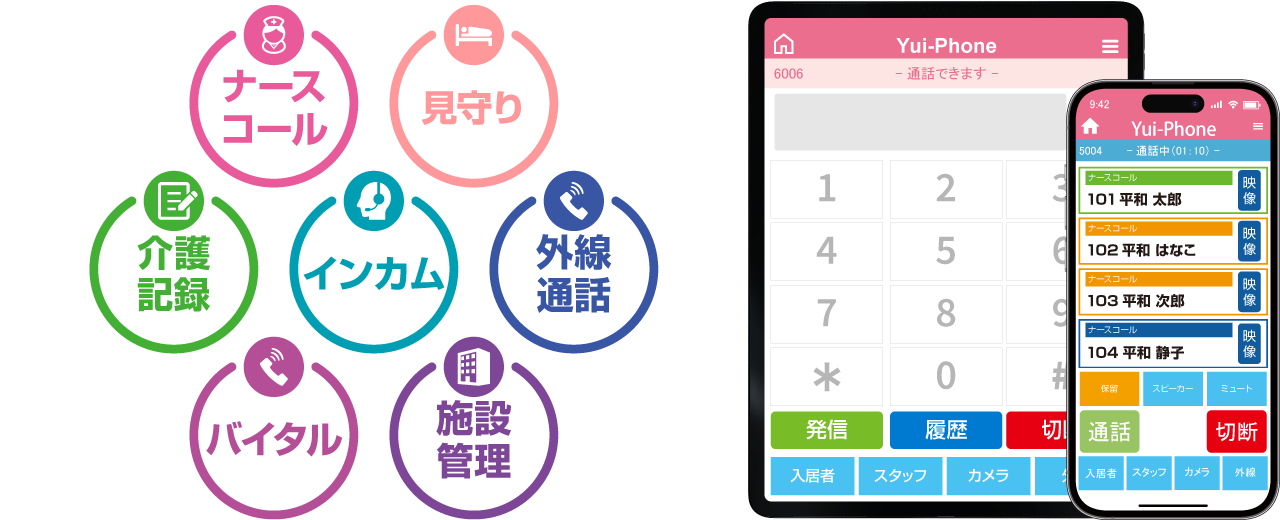 YuiPhoneは、スマートフォンの機器やメーカー、OSの種類に関係なく利用できる柔軟なナースコールアプリです。